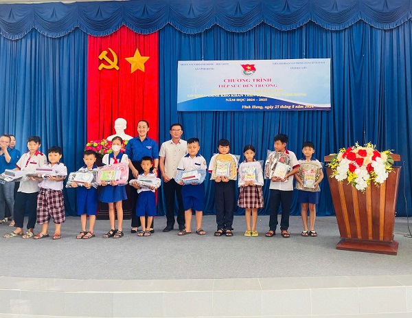 Tại buỗi lễ, đoàn đã tặng 20 phần quà, mỗi phần quà gồm 20 quyển tập và 01 ba lô cho các em học sinh có hoàn cảnh khó khăn trên địa bàn xã Vĩnh Hưng.
