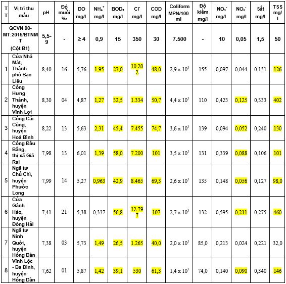 Sở Tài nguyên và Môi trường lấy mẫu nước mặt mỗi tháng 01 lần vào ngày 15 âm lịch tại 08 điểm đại diện ở các huyện, thị xã, thành phố (cửa Nhà Mát, phường Nhà Mát, thành phố Bạc Liêu; cống Lầu Bằng, xã Tân Phong, thị xã Giá Rai; Ngã tư Chủ Chí, xã Phong Thạnh Tây B, huyện Phước Long; cống Hưng Thành, huyện Vĩnh Lợi; cống Cái Cùng, huyện Hòa Bình; cửa Gành Hào, huyện Đông Hải; sông Cái Ba Đình, xã Vĩnh Lộc, huyện Hồng Dân; Ngã tư Ninh Quới, huyện Hồng Dân) để phân tích 13 chỉ tiêu nước/mẫu. Kết quả như sau: