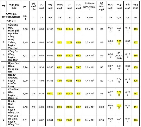 Sở Tài nguyên và Môi trường lấy mẫu nước mặt mỗi tháng 01 lần vào ngày 15 âm lịch tại 08 điểm đại diện ở các huyện, thị xã, thành phố (cửa Nhà Mát, phường Nhà Mát, thành phố Bạc Liêu; cống Lầu Bằng, xã Tân Phong, thị xã Giá Rai; Ngã tư Chủ Chí, xã Phong Thạnh Tây B, huyện Phước Long; cống Hưng Thành, huyện Vĩnh Lợi; cống Cái Cùng, huyện Hòa Bình; cửa Gành Hào, huyện Đông Hải; sông Cái Ba Đình, xã Vĩnh Lộc, huyện Hồng Dân; Ngã tư Ninh Quới, huyện Hồng Dân) để phân tích 13 chỉ tiêu nước/mẫu. Kết quả như sau: