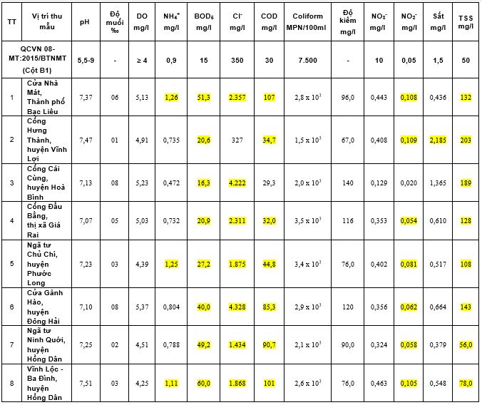 Sở Tài nguyên và Môi trường lấy mẫu nước mặt mỗi tháng 01 lần vào ngày 15 âm lịch tại 08 điểm đại diện ở các huyện, thị xã, thành phố (cửa Nhà Mát, phường Nhà Mát, thành phố Bạc Liêu; cống Lầu Bằng, xã Tân Phong, thị xã Giá Rai; Ngã tư Chủ Chí, xã Phong Thạnh Tây B, huyện Phước Long; cống Hưng Thành, huyện Vĩnh Lợi; cống Cái Cùng, huyện Hòa Bình; cửa Gành Hào, huyện Đông Hải; sông Cái Ba Đình, xã Vĩnh Lộc, huyện Hồng Dân; Ngã tư Ninh Quới, huyện Hồng Dân) để phân tích 13 chỉ tiêu nước/mẫu. Kết quả như sau: